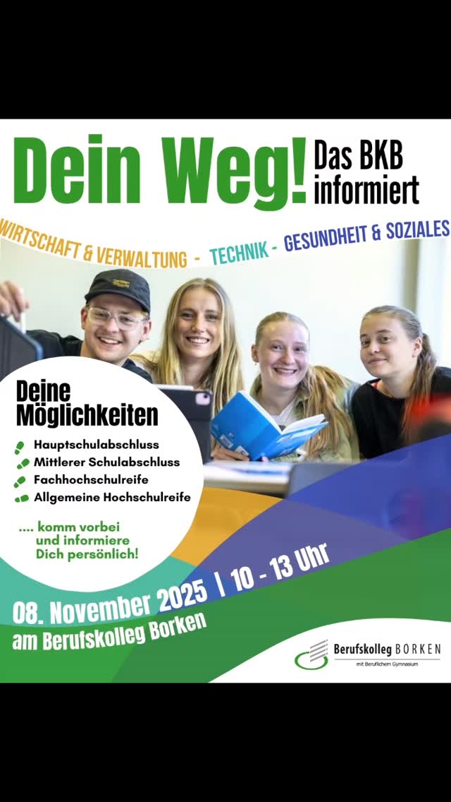 Das Berufskolleg Borken – kurz BKB – bietet im Kreis Borken vielfältige Bildungsmöglichkeiten an. Ob Berufsausbildung oder Erlangung eines Schulabschlusses, am BKB übernehmen wir alle Verantwortung dafür, dass wir durch gute Arbeits- und Lernbedingungen unsere Ziele erreichen können. Wir – Lernende, Lehrende und alle weiteren Beteiligten – gestalten das Schulleben gemeinsam, damit alle an unserer Schule gern miteinander lernen, lehren und arbeiten.