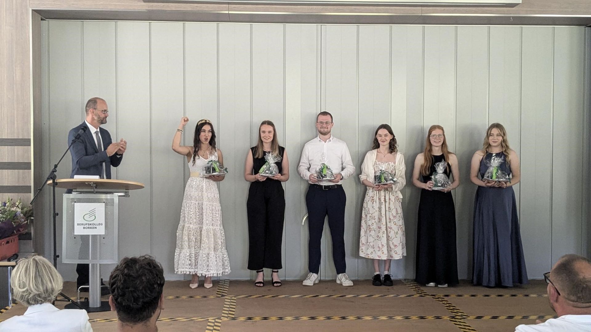 Am 28. Juni 2024 wurden die zahlreichen Absolventinnen und Absolventen in einer feierlichen Veranstaltung im Forum des Berufskollegs Borken verabschiedet. Ein Grußwort an die Schüler richtete in diesem Jahr unter anderem Annette Brun, Vorsitzende des Ausschusses für Jugend und Bildung im Kreis Borken. Sie verglich dabei aus aktuellem Anlass das gemeinsame Wirken am Berufskolleg Borken mit dem einer Fußballmannschaft bei der Europameisterschaft. Bei Sport, Arbeit und auch Schule gehe es unter anderem auch um die Teamarbeit um ein Optimum herauszuholen: „Der Kreis hat gute Trainingsbedingungen bereit gestellt, aber nach dem Spiel ist vor dem Spiel…“ Daher drückte Frau Brun am Ende die Hoffnung aus, dass die Region, die Betriebe oder die Verwaltung von den erfolgreichen Absolventinnen und Absolventen auch profitieren können.