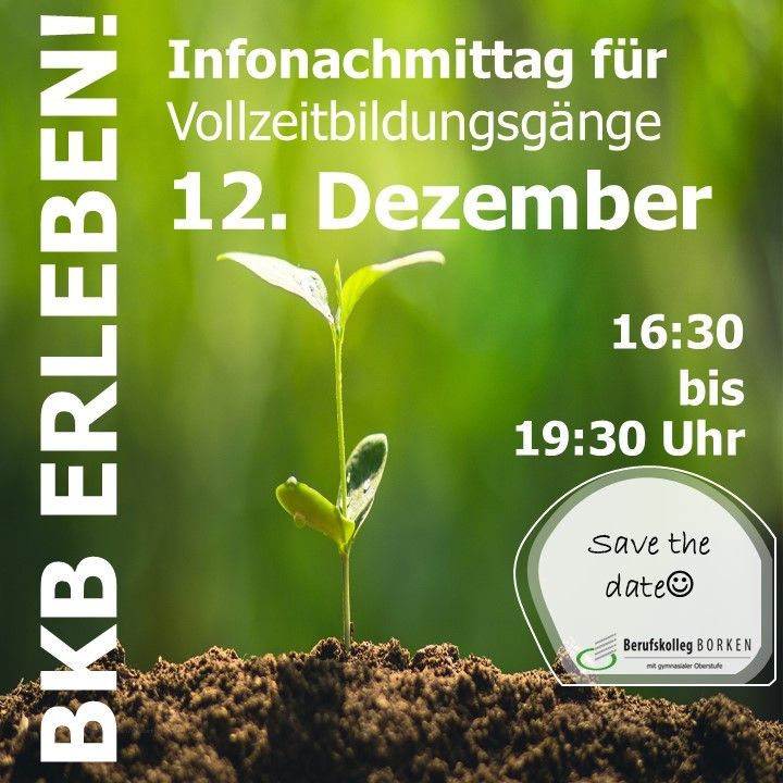 Am Donnerstag, dem 12. Dezember 2024, öffnet das Berufskolleg Borken nachmittags von 16:30 bis 19:30 Uhr seine Türen, um im Rahmen eines Infonachmittags Schülerinnen und Schülern die Möglichkeit zu geben, die Schule und vor allem den Unterricht in den Kernfächern der verschiedenen Vollzeitbildungsgänge zu erleben.