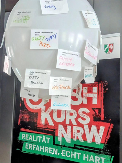 Beklemmend war zum Ende der Veranstaltung das Zerplatzen der Lebensträume junger Leute, die als Karten von den 297 Teilnehmer*innen der Veranstaltung an einen großen Luftballon geklebt waren…