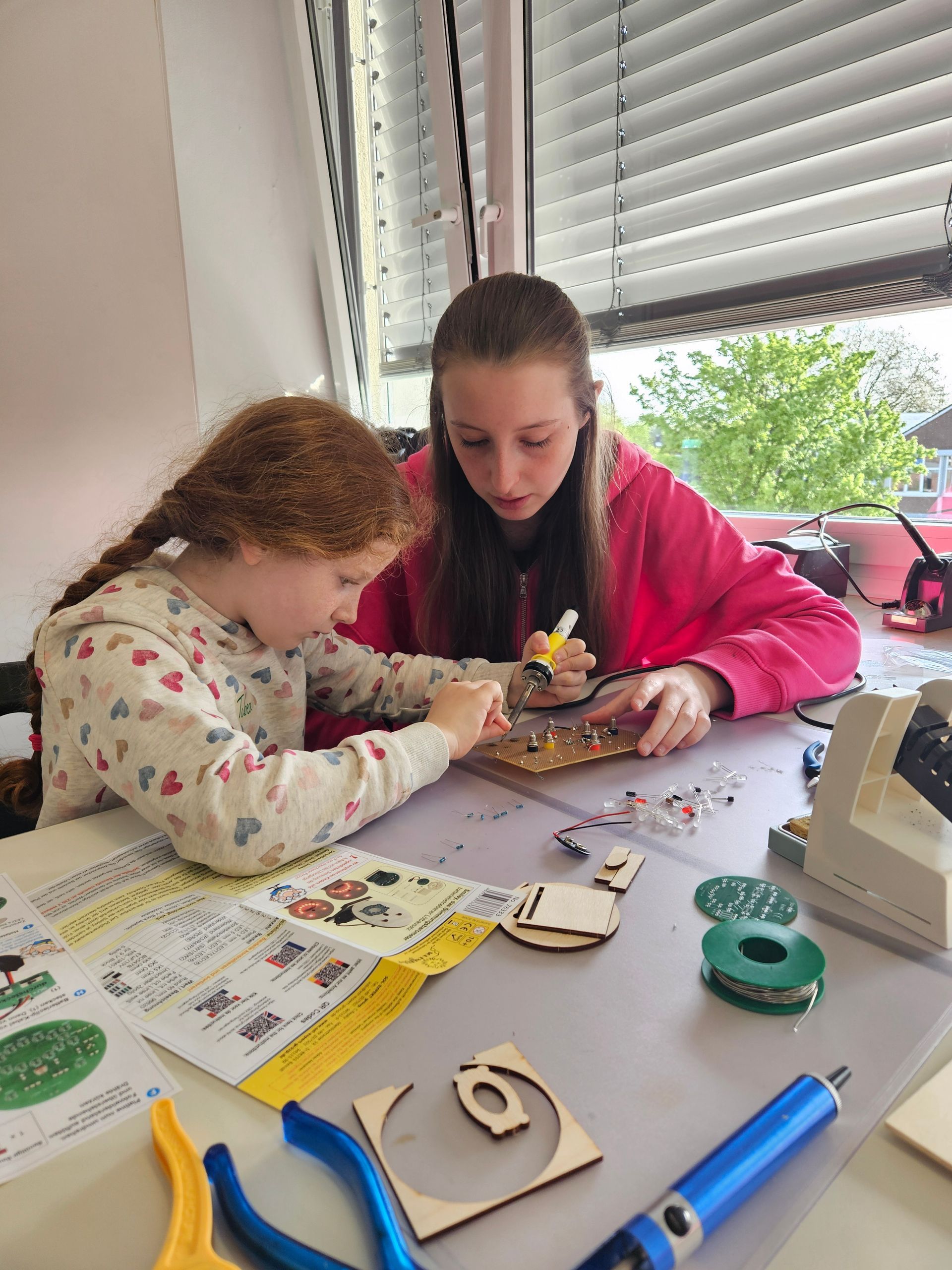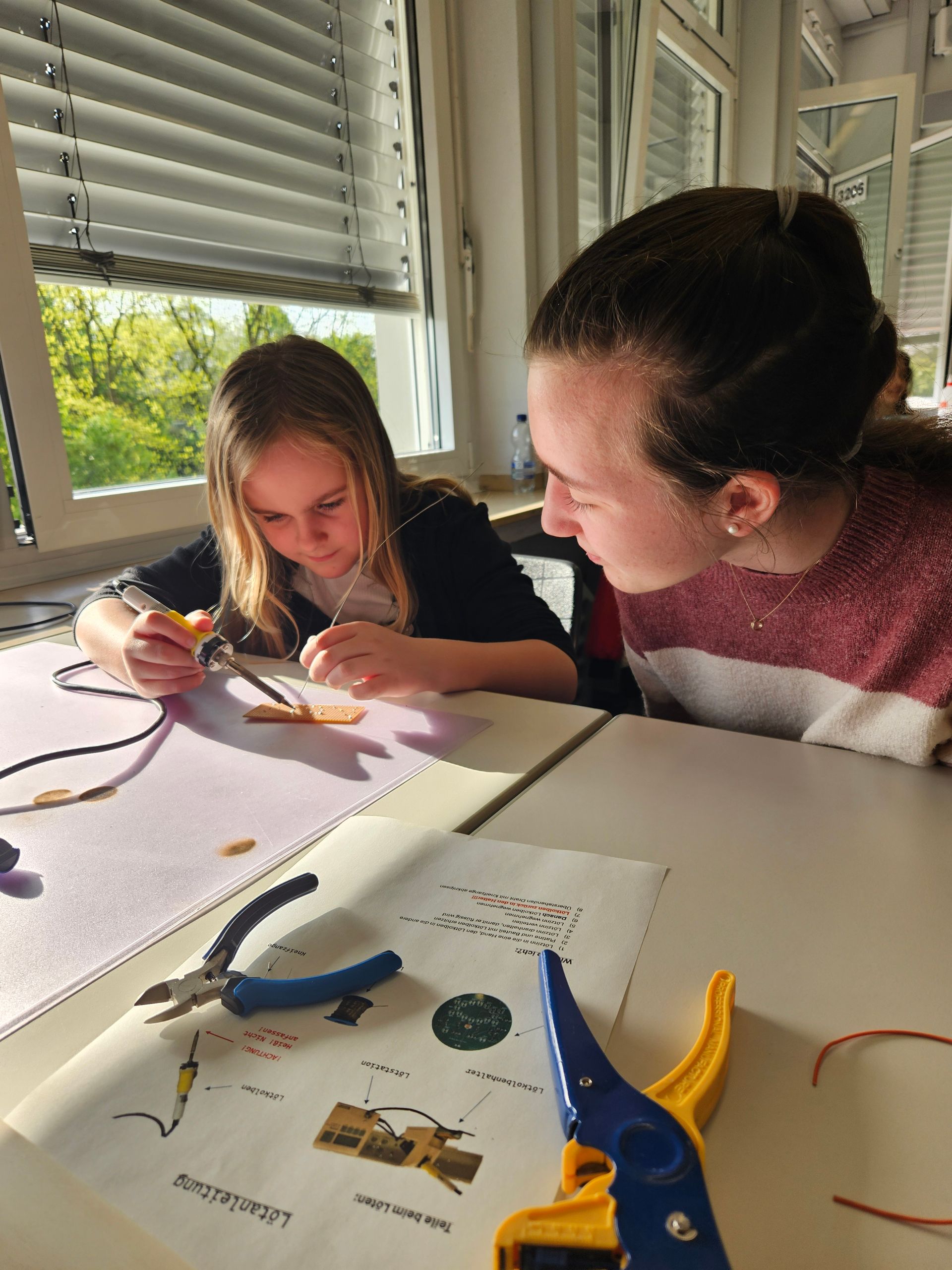 So lernen nicht nur die Grundschulkinder das Löten bei uns am Berufskolleg, sondern auch unsere Schülerinnen und Schüler profitieren von der „Elektrowerkstatt“: Die Fachoberschule für Soziales bekommt einen Einblick in technische Projekte, während die GT sich mit der adressatengerechten Gestaltung eines solchen Projektes auseinandersetzen muss.