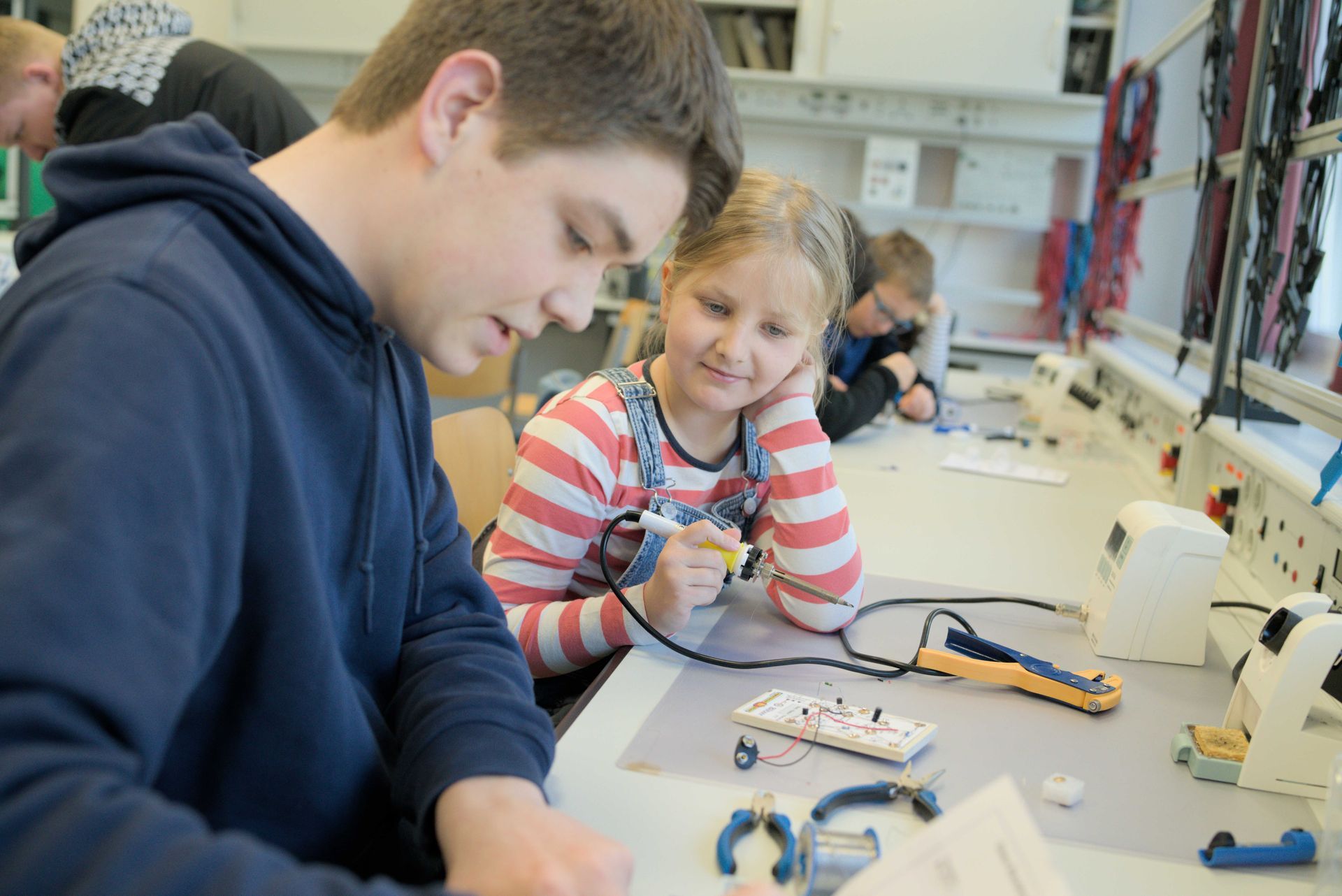 Beide Klassen vertiefen dadurch ihre Fähigkeiten und Fertigkeite, sowohl in theoretischen als auch in praktischen Bereichen. „Nach einigen Austauschtreffen im Vorfeld, bei denen geplant und geübt wurde, können alle Schülerinnen und Schüler (FS und GT) den Drittklässlern in einer 1-zu-1 Betreuung das Löten in der „Elektrowerkstatt“ beibringen“, so Tobias Finke, der stolz auf die jungen Leute ist.