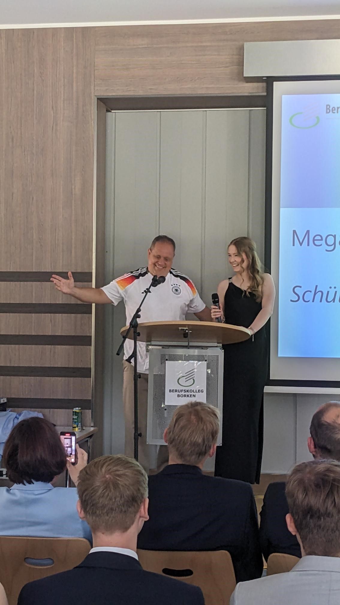 Schülersprecherin und Abiturientin Megan Tenbrake (GG21A) ließ gemeinsam mit Roland Frohmann, dem Bildungsgangleiter des Wirtschaftsgymnasiums und Klassenlehrer der GW21A, in einer spritzigen Rede den erlebten Schulalltag von drei bewegten Jahren inklusive der Abschlussfahrt nach Spanien aus Schüler- sowie Lehrerperspektive Revue passieren. Sie sprachen den Klassen- und Fachlehrerinnen und -lehrern sowie den Eltern ein großes Lob und ihren Dank für das Engagement und die Unterstützung in dieser nicht immer ganz einfachen Zeit aus.