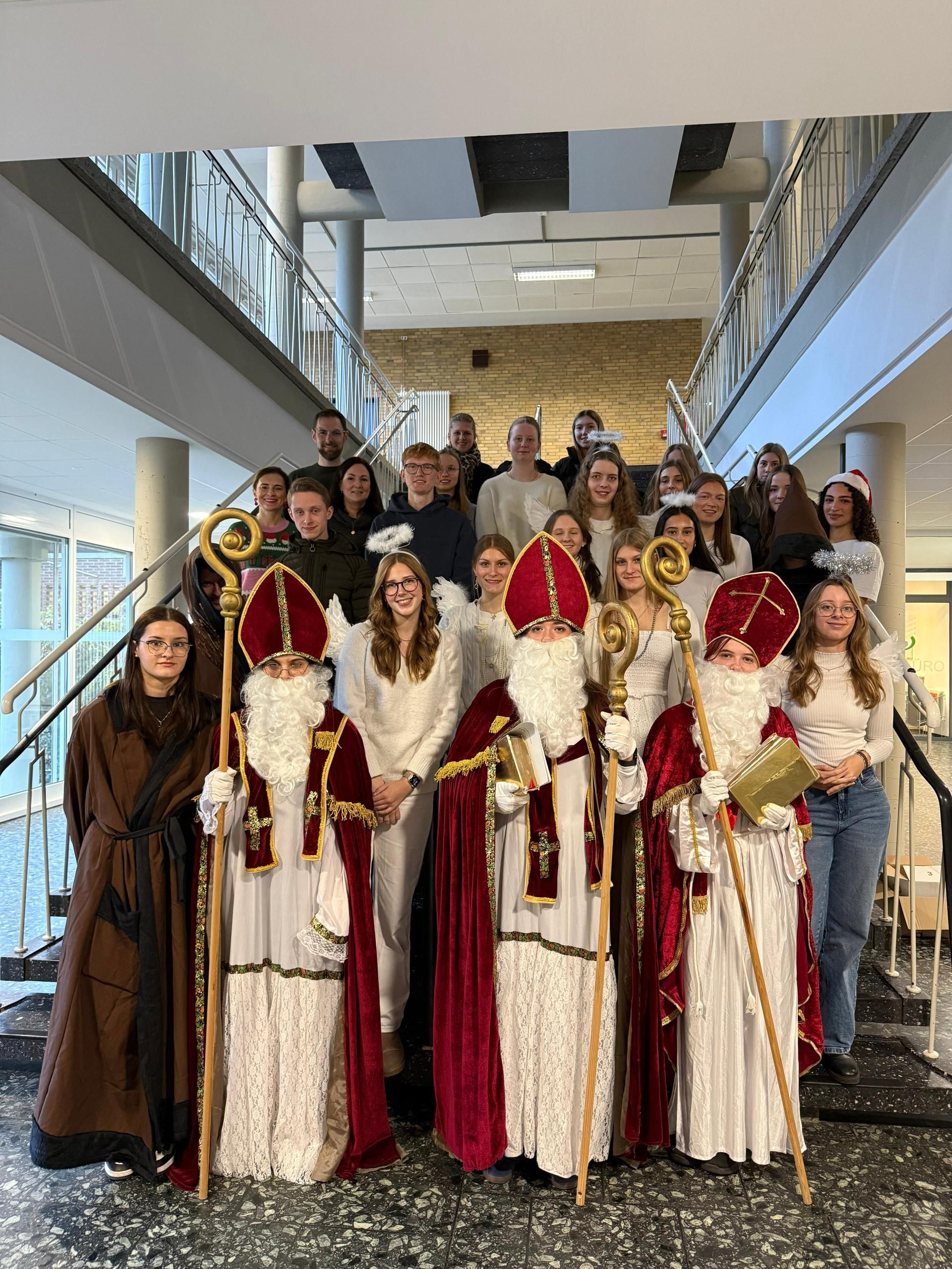 Der Nikolaus zog mit Sack und Pack und seinem großen Team den ganzen Vormittag durch die Schule und freute sich über Lieder, Texte und Gedichte, die sowohl die Klassen als auch die Lehrkräfte zum Besten geben mussten, um einen süßen Nikolaus-Gruß in Empfang nehmen zu können! In diesem Jahr bestand dieser aus leckeren Plätzchen, die unsere angehenden Bäcker*innen, Konditor*innen sowie Bäckerei- und Konditoreifachverkäufer*innen gemeinsam mit ihrem Lehrer Herrn Leuering gebacken haben.